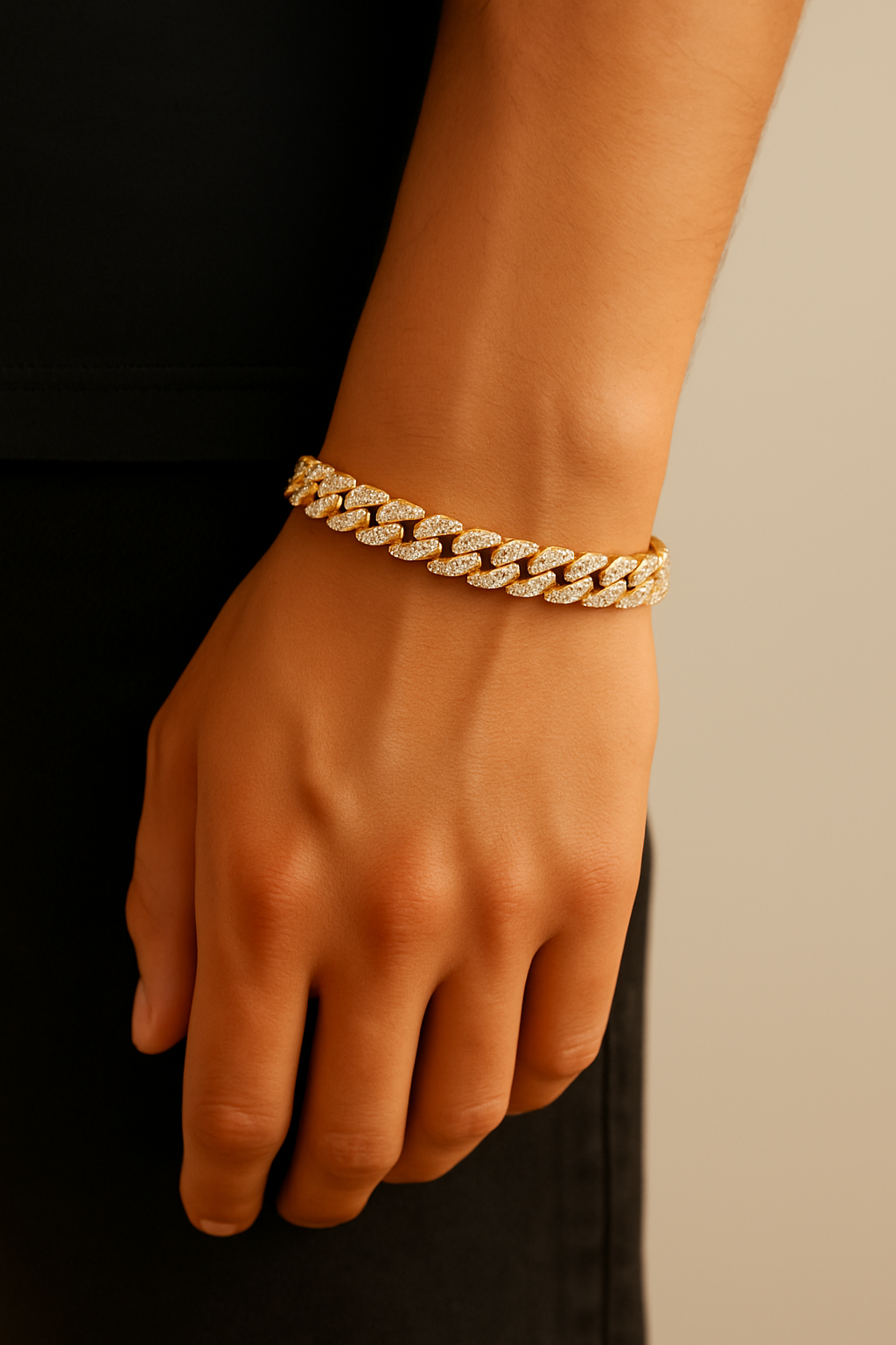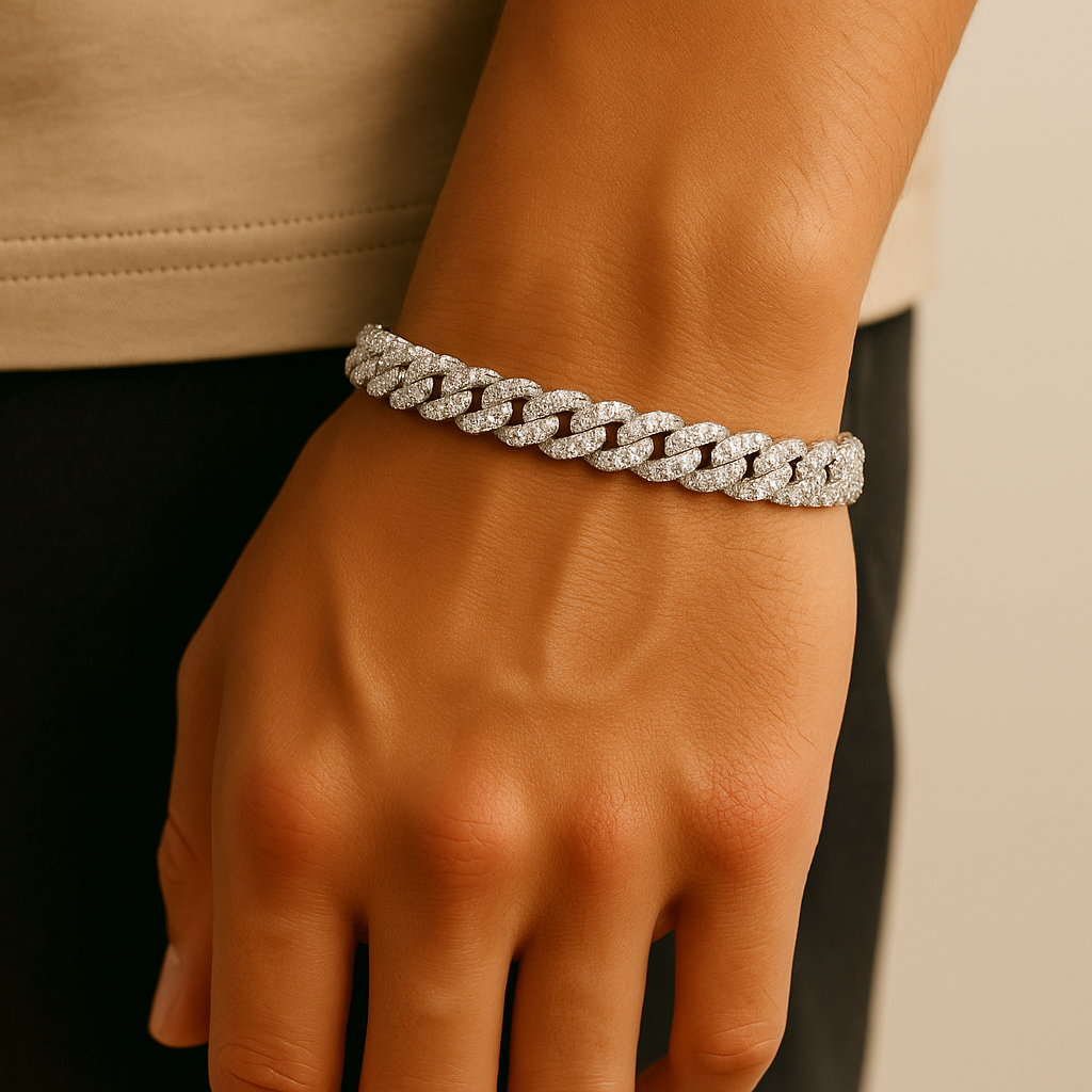 Refined yet bold, the 10mm iced Cuban bracelet brings precision-cut stones and a polished finish to every wrist. Comfortable, confident, and built to shine.