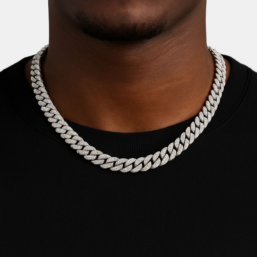 Engineered for impact. This heavyweight 12mm Cuban chain is iced end-to-end with hand-set stones, built on 316L stainless steel. Hypoallergenic, water-resistant, and made to speak before you do.