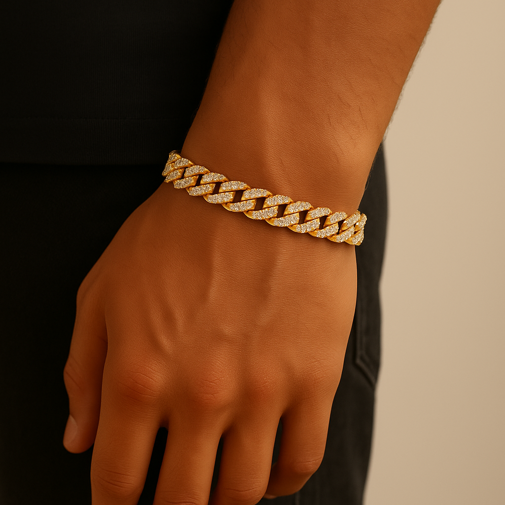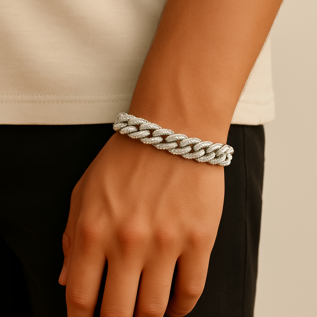 With fully iced links and a solid build, the 12mm Cuban bracelet delivers statement-level shine. Each stone is handset to reflect maximum light and attention.