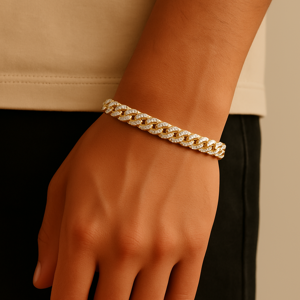 The cleanest way to add ice. This 8mm Cuban bracelet features hand-set stones over sleek, compact links. Lightweight feel, heavy shine.